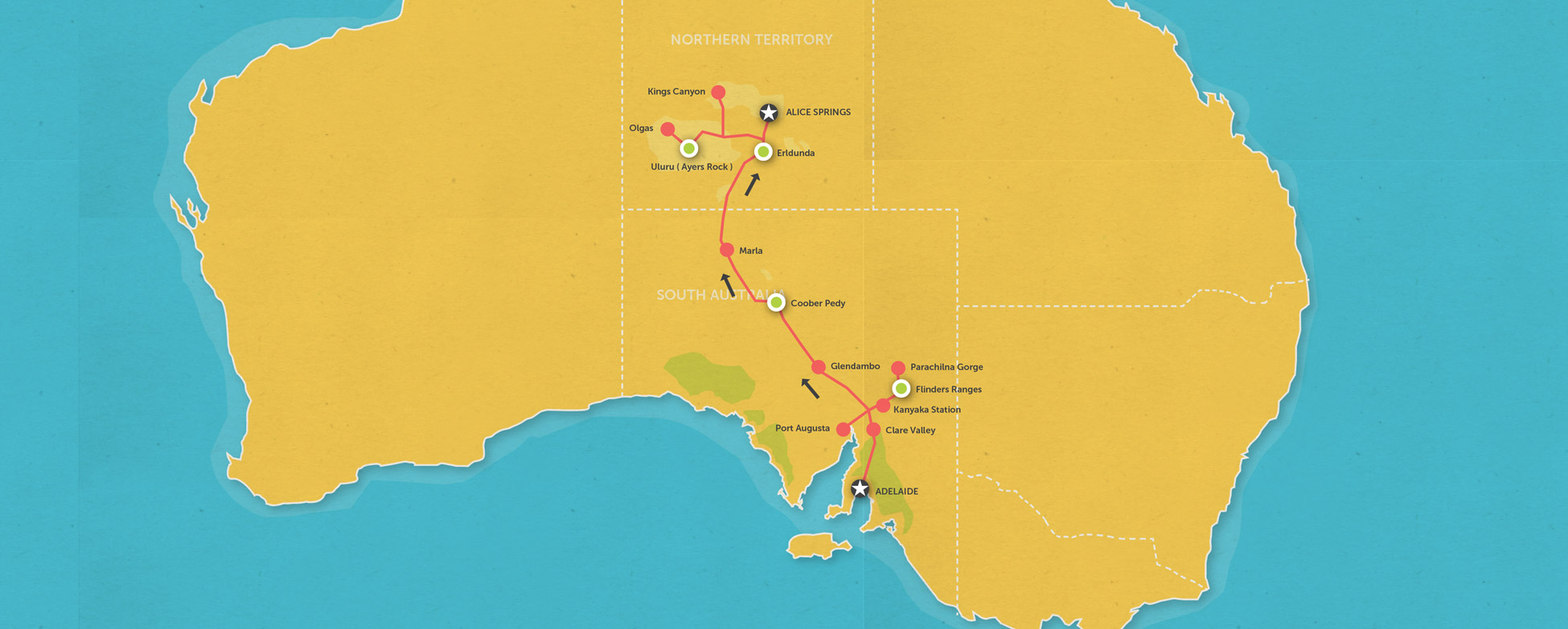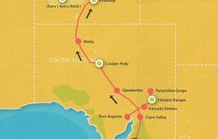The journey from Adelaide to Alice Springs takes us to famous sites such as Uluru (Ayers Rock), Kata Tjuta (The Olgas), Kings Canyon in Wattarka National Park, Flinders Ranges, Wilpena Pound, Quorn and the opal mining town of Coober Pedy.