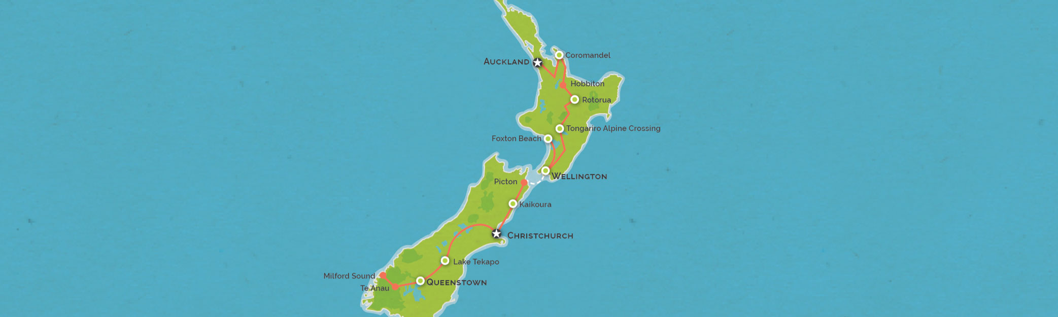 This 16 day trip travels from Auckland to Queenstown and is suited for couples and active travellers wanting beaches, mountains, lakes and varied activities. It includes walking, cycling and visits to Rotorua, Tongariro, Kaikoura, Aoraki/Mt Cook, Milford Sound and more across both islands.